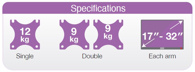 Weight capacity up to 12kg for monitor sizes of 17"-32"